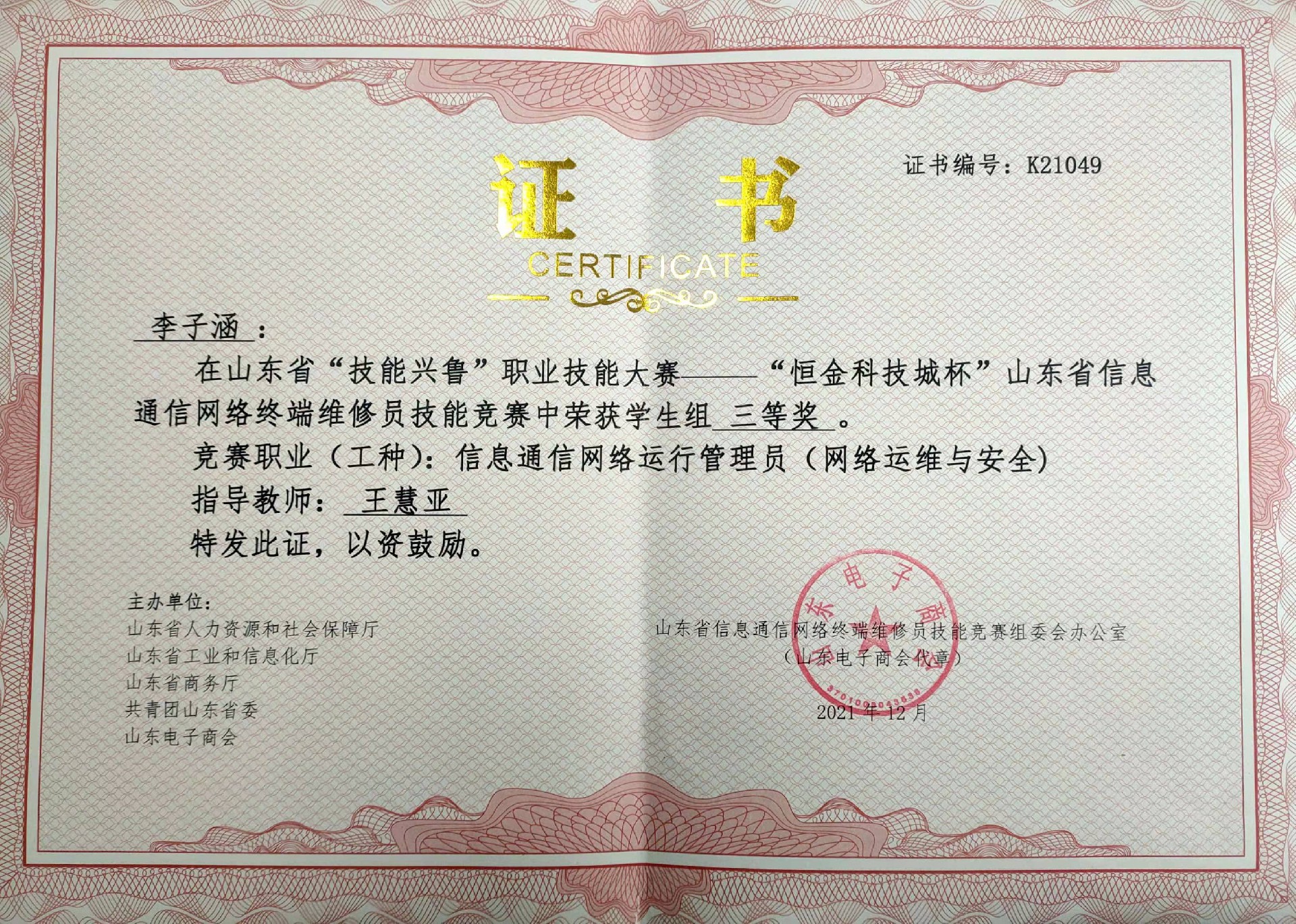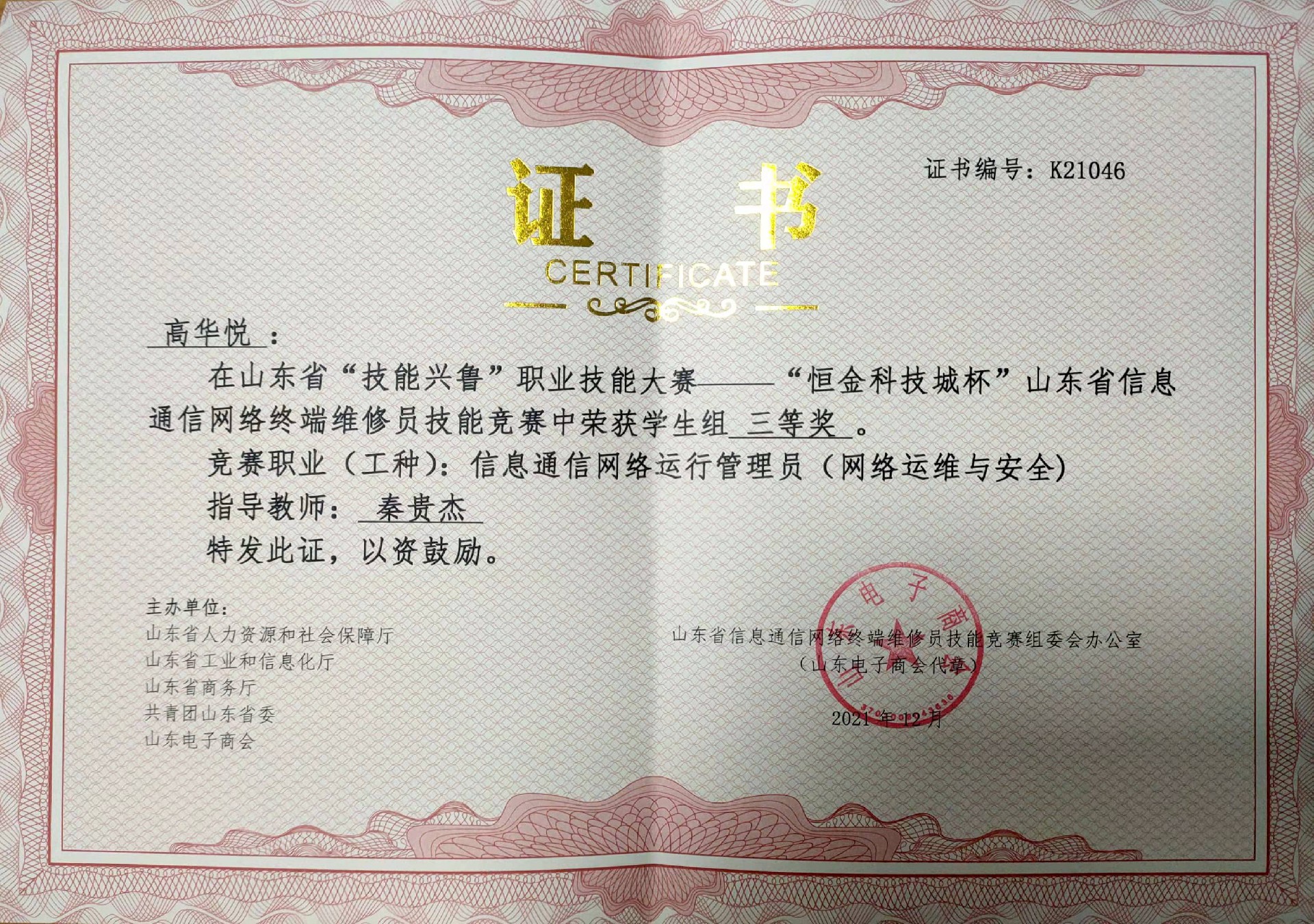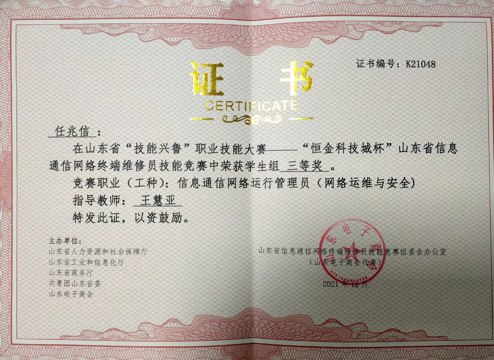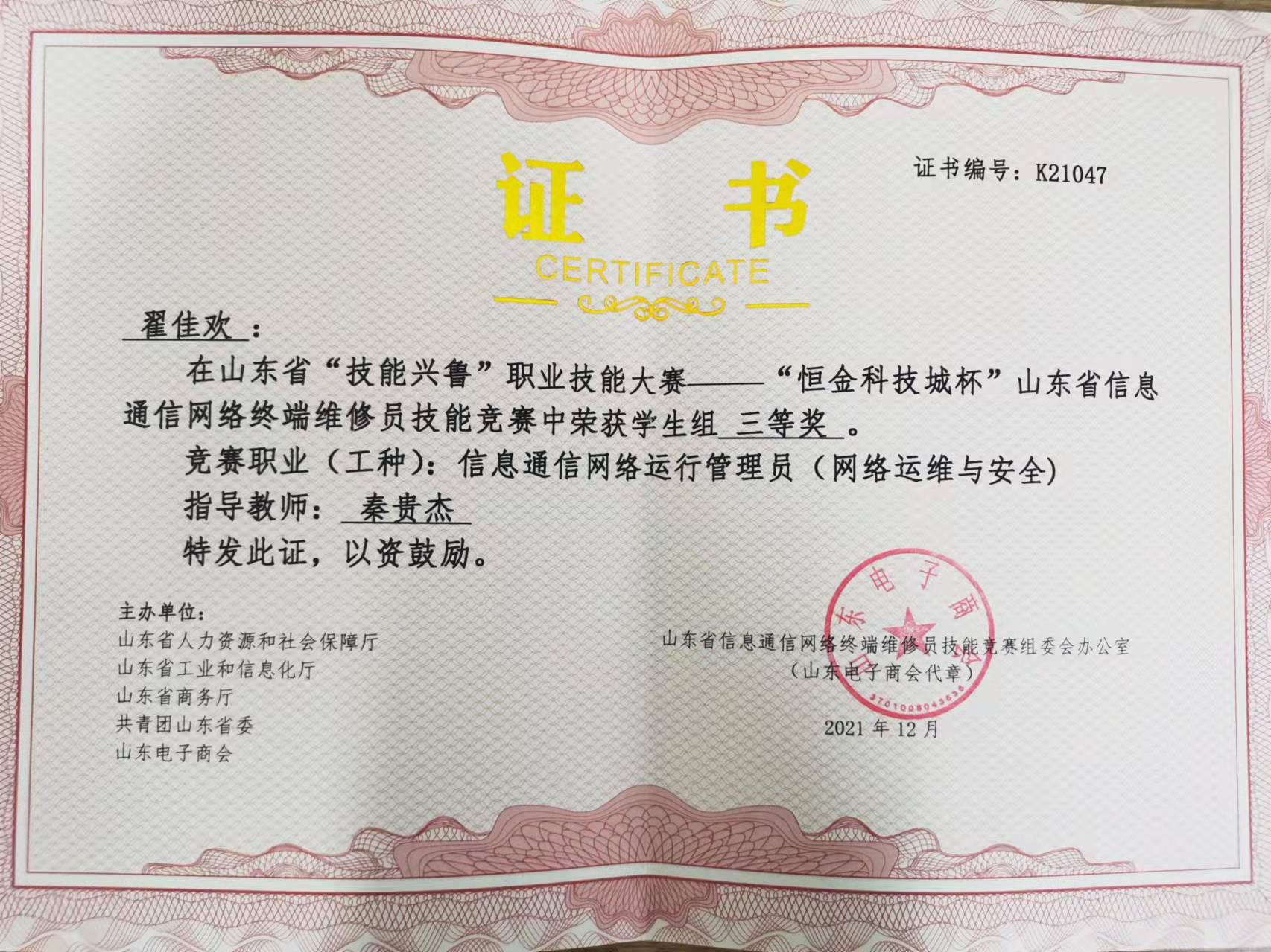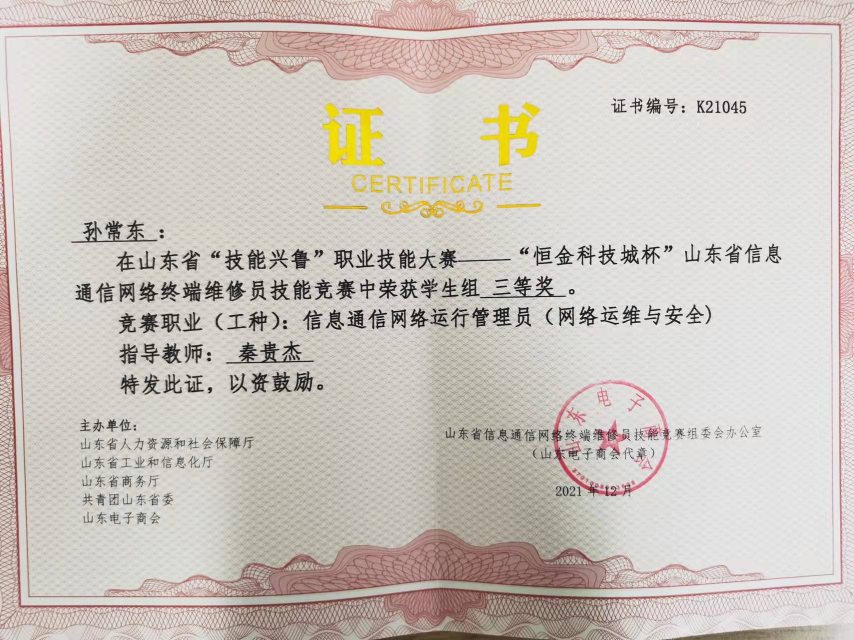 在2021年山东省“技能兴鲁”职业技能大赛——网络运维与安全赛项中,我校学子荣获5项三等奖。网络运维与安全赛项有来自全省的共26个高职院校、中职院校以及企业代表队参赛,我校现代服务业部计算机专业孙常东、高华悦、翟佳欢、李子涵、任兆信五名同学参加了比赛并取得优秀成绩。 比赛采取个人比赛的方式进行,赛程4个小时。比赛形式以实践操作为主,以现场过程评价与完成任务结果评价为主要考核方式,考察选手个人的综合能力与解决实际问题的能力。