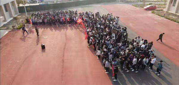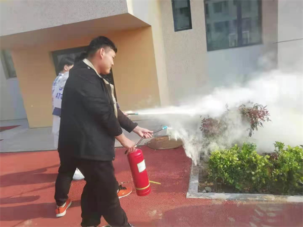 各班学生安全撤离到操场后,迅速清点班级人数,并向李卫尧教官报告人数,随后,李教官为同学们讲解了灭火器的正确使用方法,总结出5个字:看、提、拔、瞄、压,并指导三名学生代表进行灭火器实操。