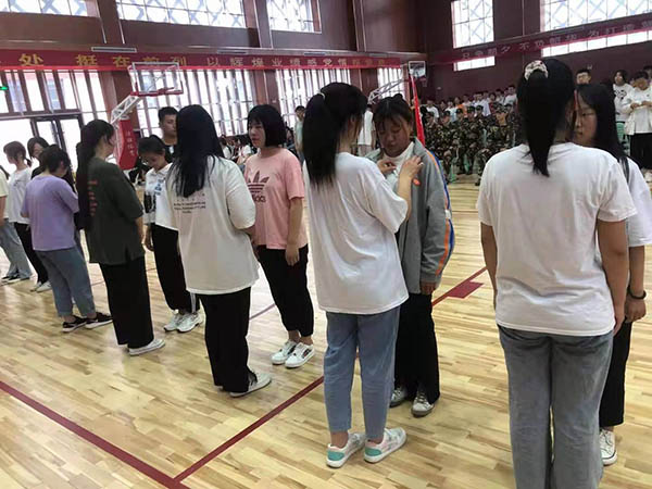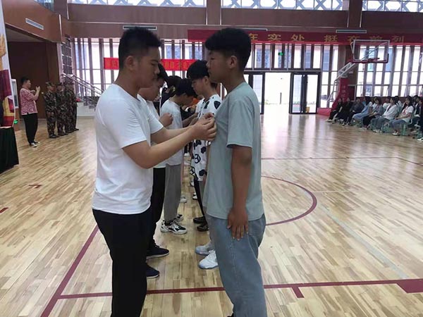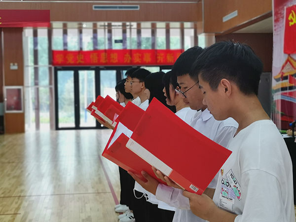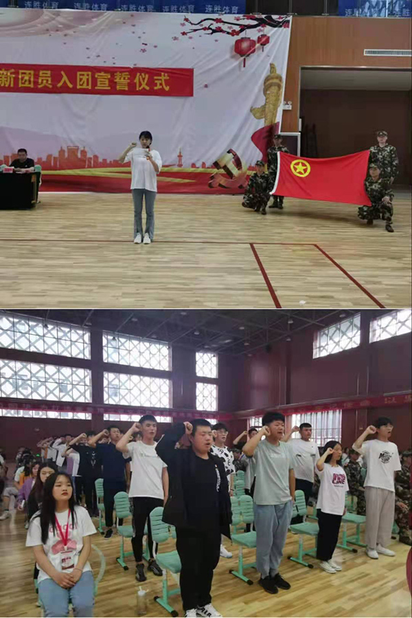 接下来,新老团员依次上台,老团员代表为各位新团员佩戴团徽,新团员面向团旗,在校团总支副书记田文秀同学的领誓下高举右手庄严宣誓。铮铮誓词在风雨操场内回荡,每位团员表情庄严肃穆,誓词铿锵有力!