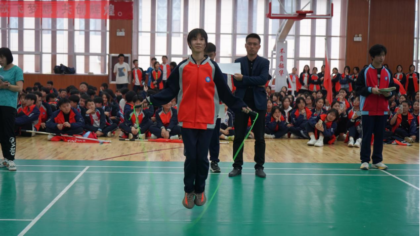 半个多月来,经过各教学部预赛,筛选进入学校总决赛的学生。一分钟单人跳绳男子组56人,女子组30人;八字绕绳17个班级;八人齐跳17个班级。各教学部同学们为备战比赛,利用课余时间紧张而有序的进行着跳绳训练,今天终于能在赛场上一展身手了。