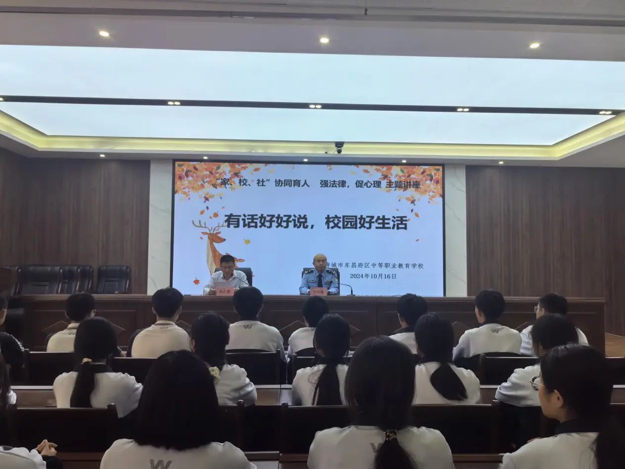 为深入贯彻习近平总书记关于学生心理健康工作的重要指示,进一步落实《全面加强和改进新时代学生心理健康工作专项行动计划(2023—2025年)》,加强校园心理健康教育,增强学生的自我保护意识和能力,有效预防和减少校园欺凌事件的发生,加强家校社之间的联动,聊城市东昌府区中等职业教育学校学生工作处围绕“家、校、社”协同育人,强法律,促心理为工作导向,结合校心理健康教育中心,于2024年10月16日开展《有话好好说,校园好生活》心理健康教育主题讲座活动。本次讲座活动特邀聊城市公安局乔洪涛同志前来授课。